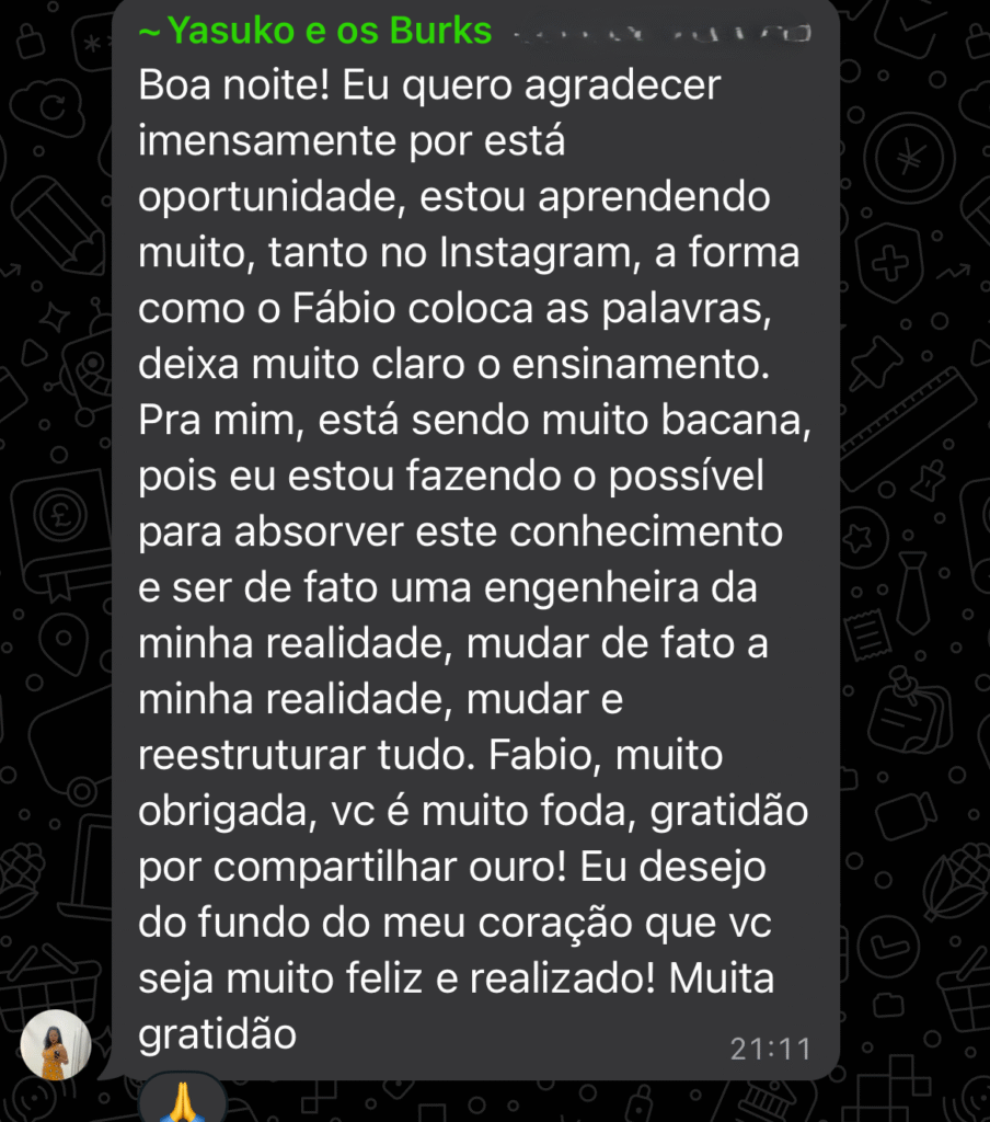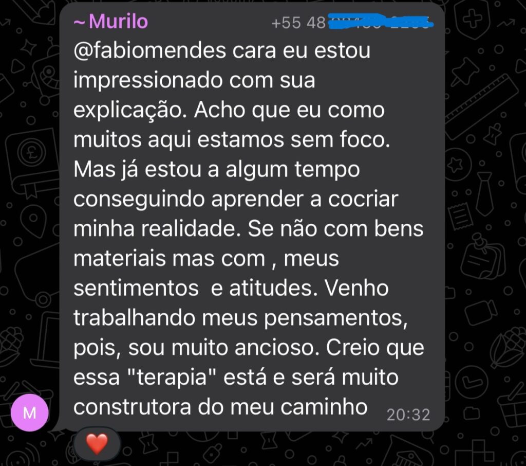 Entre para um grupo ultra-seleto de pessoas em transformação. Receba reprogramações mentais semanais direto no seu WhatsApp para acelerar sua evolução e nunca mais estagnar. Você terá acesso a técnicas avançadas, dicas exclusivas e suporte direto do Fábio para manter sua frequência sempre elevada.